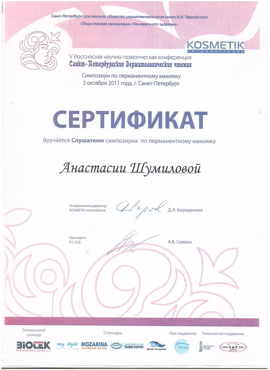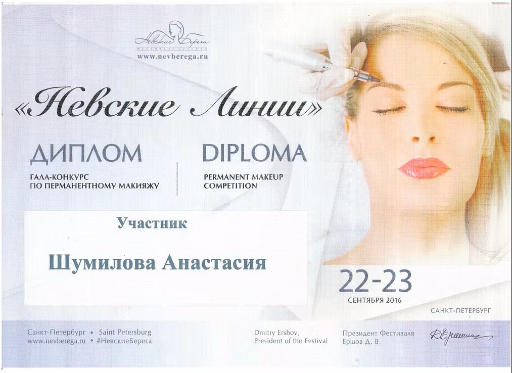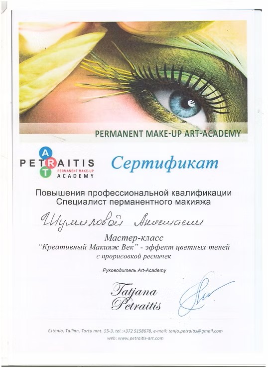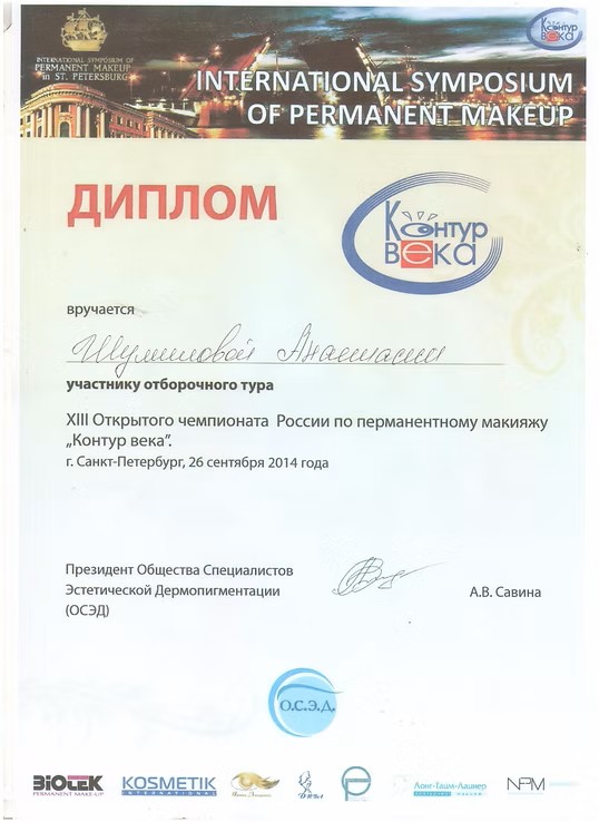 - Дипломированный Мастер Перманентного макияжа. Участник Открытого чемпионата России по перманентному макияжу "Контур века" В Санкт-Петербурге Международного класса. Участник Конгресса по перманентному макияжу в рамках Ki-expro г.Москва и г. Санкт-Петербург.