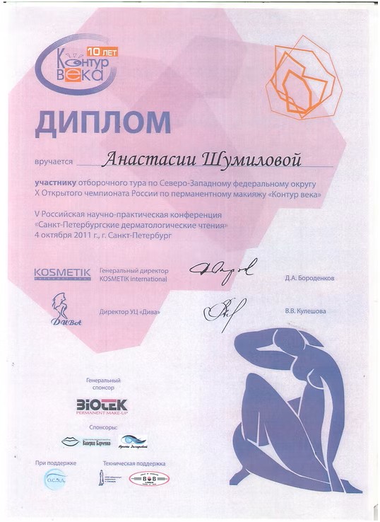 - Лауреат отборочного тура по перманентному макияжу "Контур -Века" по северо - заподному округу на кубок ОСЭД 2011 г